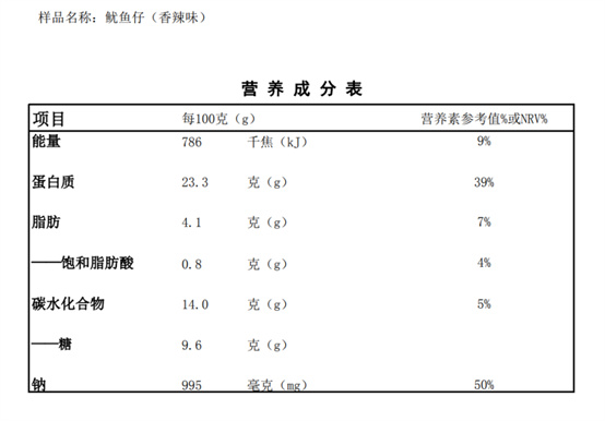 配料表:魷魚、大豆油、白砂糖、食用鹽、味精、香辛料。食品添加劑:山梨酸鉀。